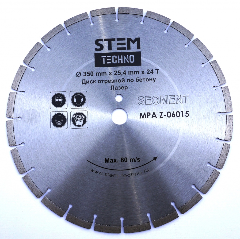 Назначение диска лазерного по бетону STEM Techno CL 350: железобетон, бордюрный камень, абразивный мрамор, шамотный кирпич, твердый песчаник, тротуарная плитка.