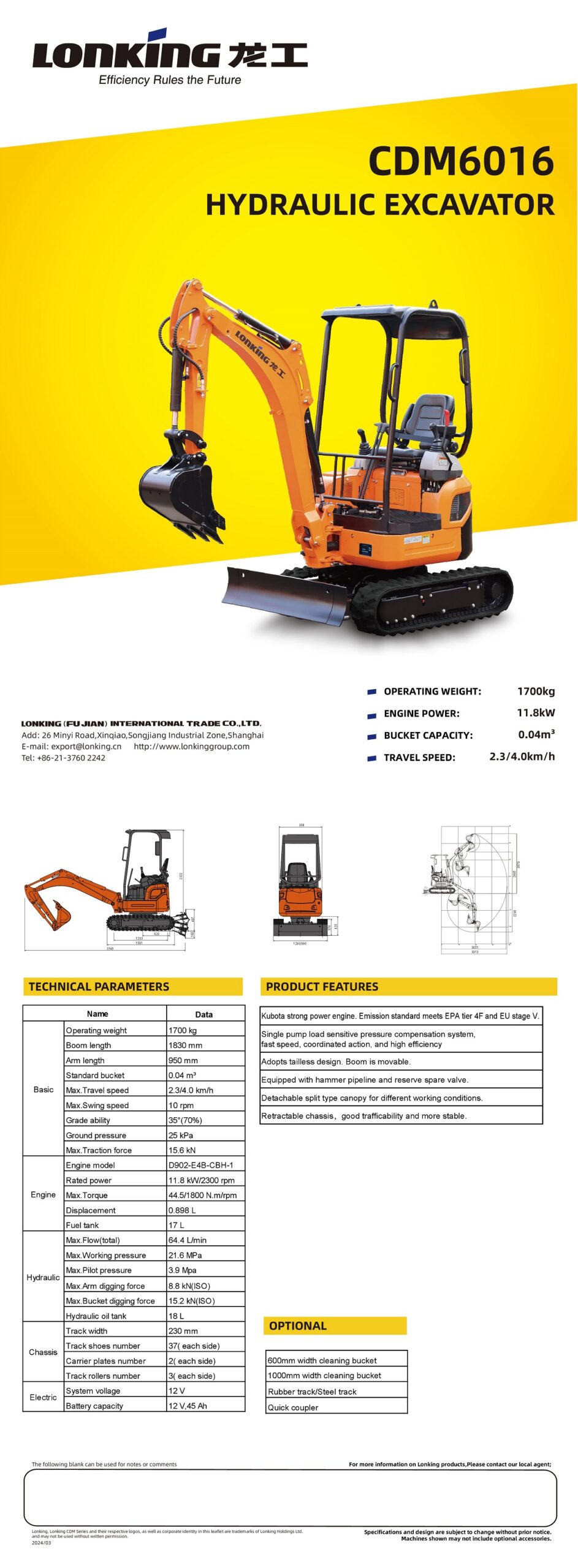 Гусеничный экскаватор Lonking CDM6016 младший в линейке мини-экскаваторов Лонкинг с массой 1700 кг и ковшом 0,04 м³