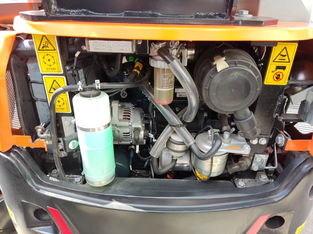 Мини-экскаватор оснащен экологичным энергосберегающим малошумным двигателем Kubota с водяным охлаждением и прямым впрыском, соответствующим стандарту выбросов Евро 3. Двигатель расположен поперечно благодаря чему обеспечен отличный доступ ко всем фильтрам, генератору, стартеру, ремням вентилятора. Задняя стенка двигательного отсека покрыта шума изолирующим и теплоизолирующим материалом.