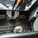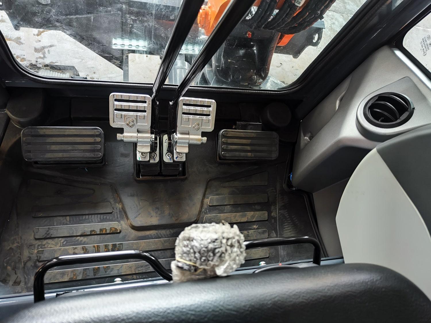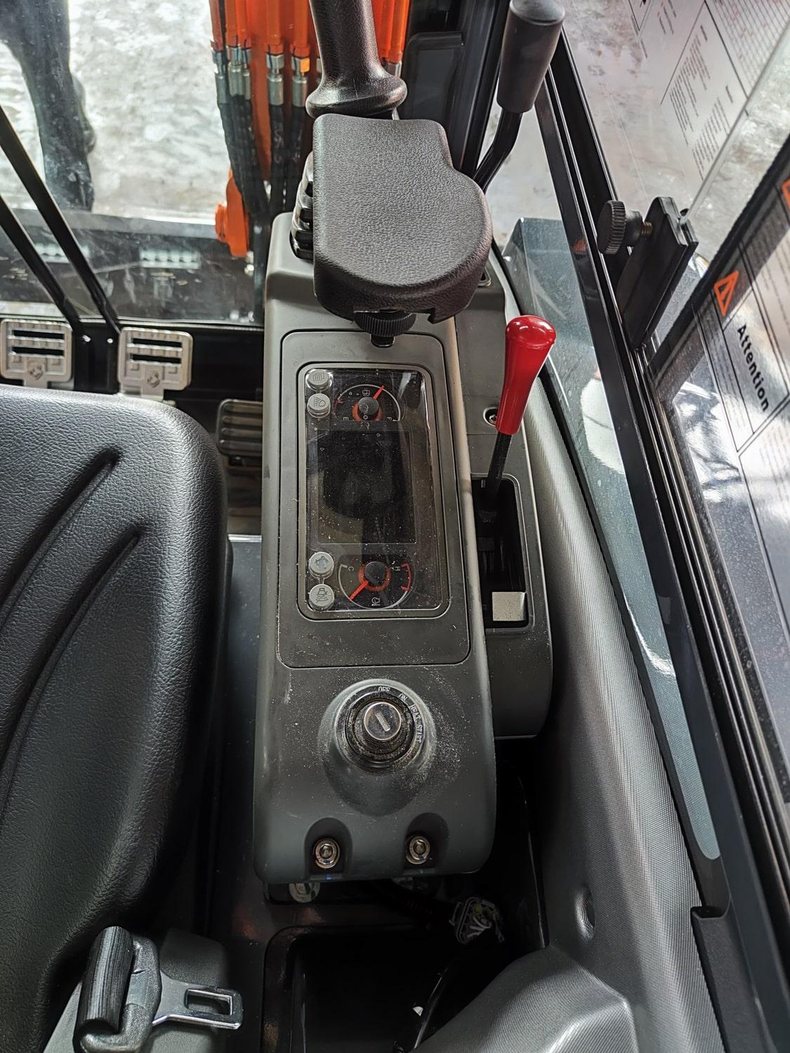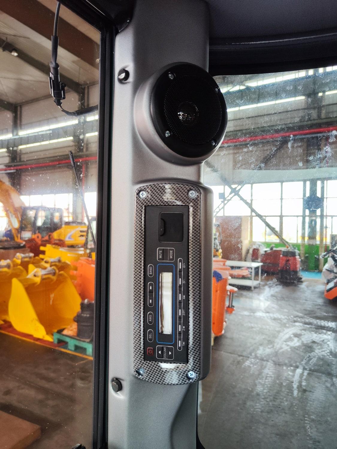 Подрессоренное сиденье с гидравлическими амортизаторами с множеством регулировок эффективно снижает утомляемость водителя при работе. В стандартной комплектации в кабине установлен кондиционер и магнитола с колонками. Наглядная и простая панель приборов отображает все основные технические параметры машины, а также предупреждает о возможных ошибках. Все основные функции вынесены на удобные клавишные переключатели, рядом установлена ручка управления оборотами двигателя. Управление рабочим органом сосредоточена на джойстиках. Здесь же имеется пропорциональный регулятор работы дополнительной гидролинии.