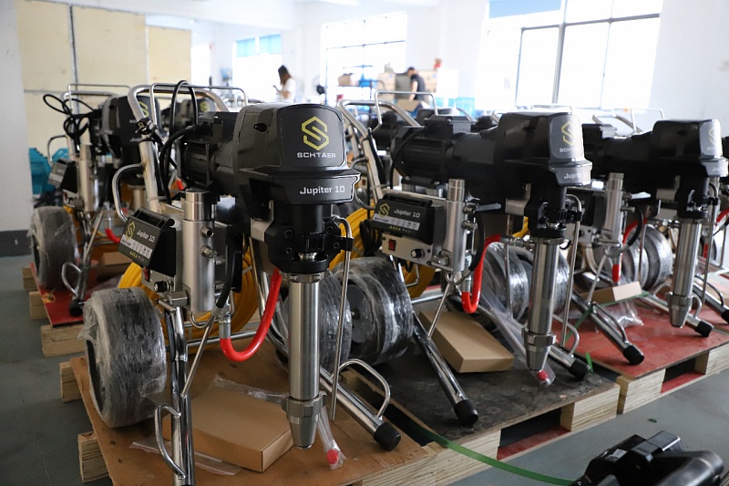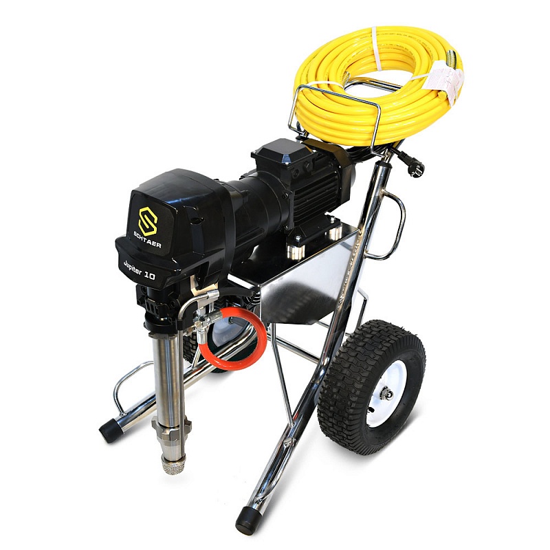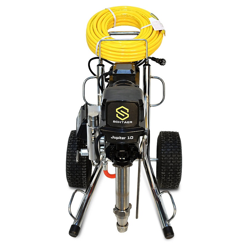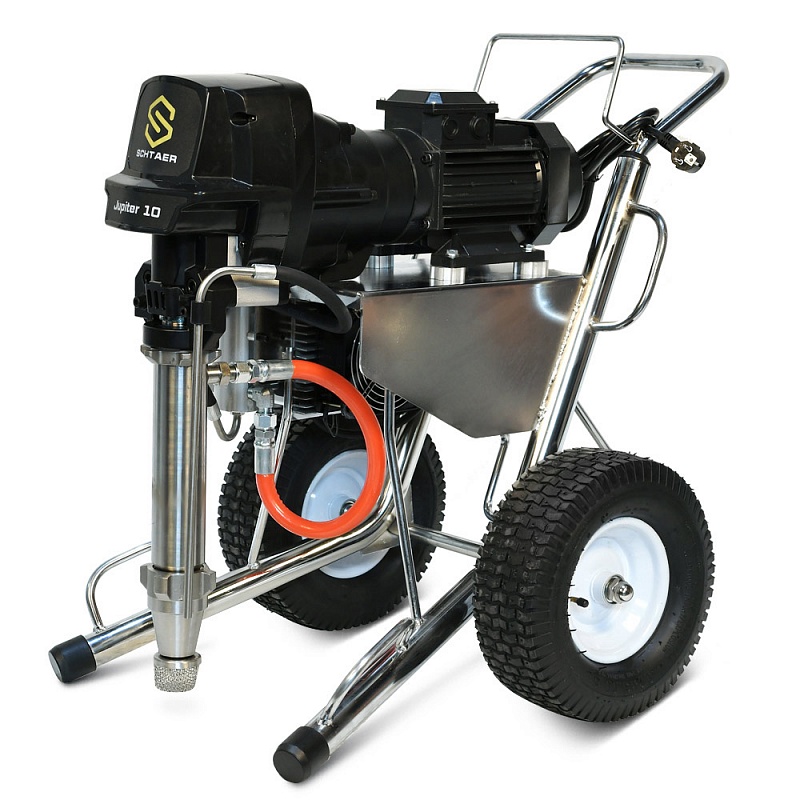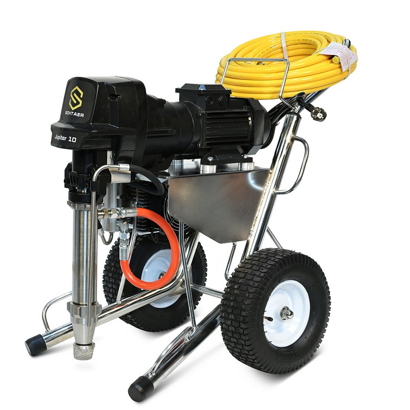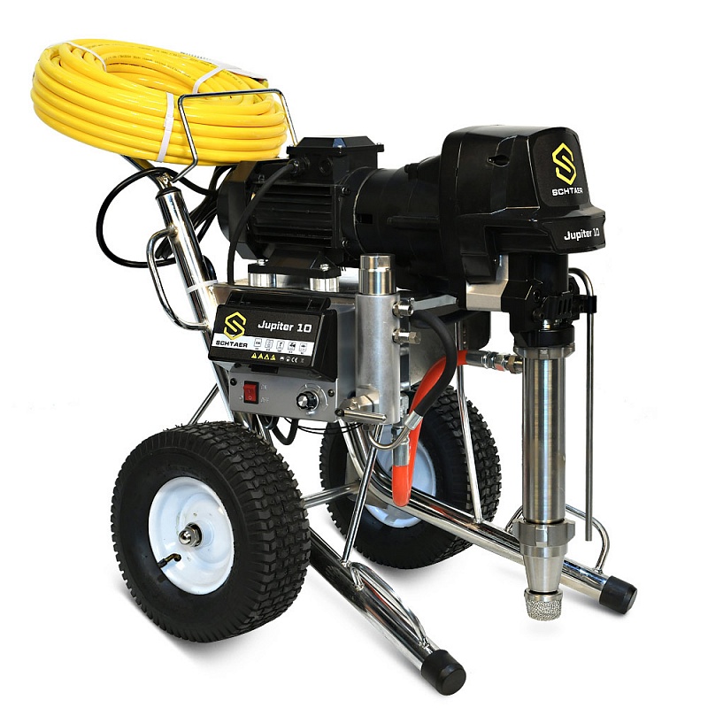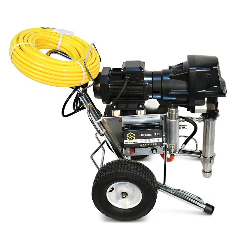 SCHTAER JUPITER 10 представляет собой окрасочный аппарат для вязких материалов. Это поршневая машина для безвоздушной окраски, способная работать с лакокрасочными материалами средней и высокой вязкости. Применяется во время нанесения ЛКМ на металлоконструкции. Подходит для нанесения финишных готовых распыляемых шпатлевок, эмалей и грунтовок, для антикоррозионных красок по металлу. А также для работы с акриловыми и латексными красками для стен, фасадов и потолков, красок по дереву и другими вязкими лакокрасочными материалами. Отличается высокой скоростью распыления (8 л/мин) и большой мощностью (3 000 Вт). Работает под давлением 230 Бар от электрической сети с напряжением 220 В.