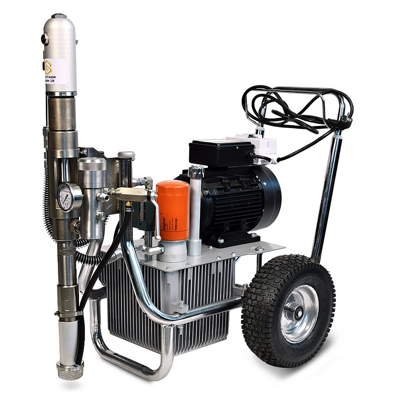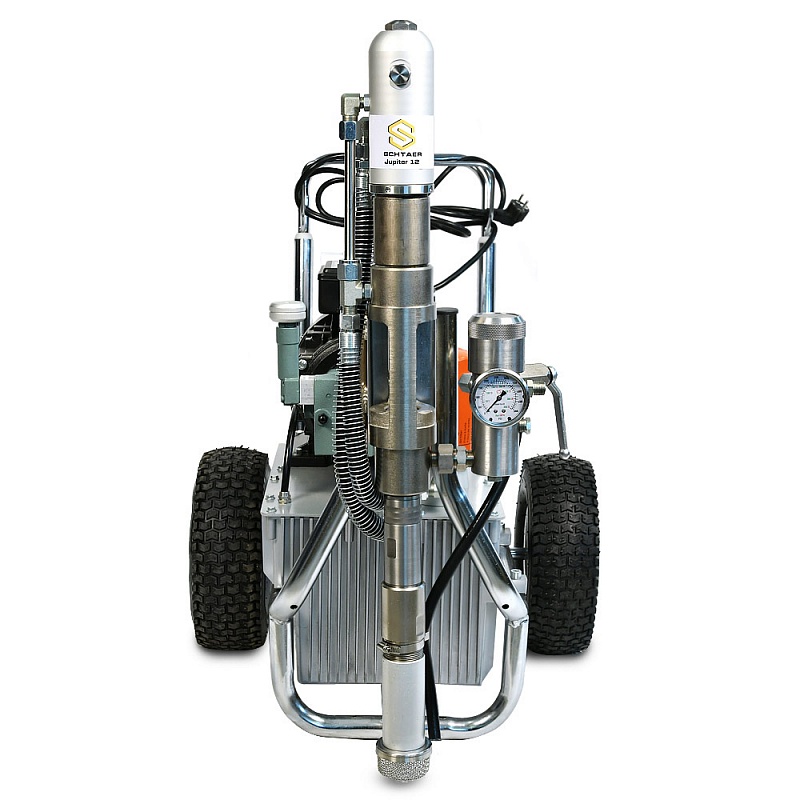 SCHTAER JUPITER 12 — поршневой безвоздушный окрасочный аппарат. Он подходит для распыления высоковязких красок, огнезащитных составов, гидроизоляционных материалов, мастик, антикоррозионных красок, цинконаполненных материалов, шпатлевок, грунтов и других материалов, пригодных для нанесения через поршневой безвоздушный окрасочный агрегат. Применяется на строительных площадках при покраске стен, потолков, фасадов, металлических конструкций, крыш, бассейнов, куполов, металлических балок, заборов, мостов, тоннелей, а также для нанесения дорожной разметки при условии использовании дополнительного оборудования.