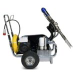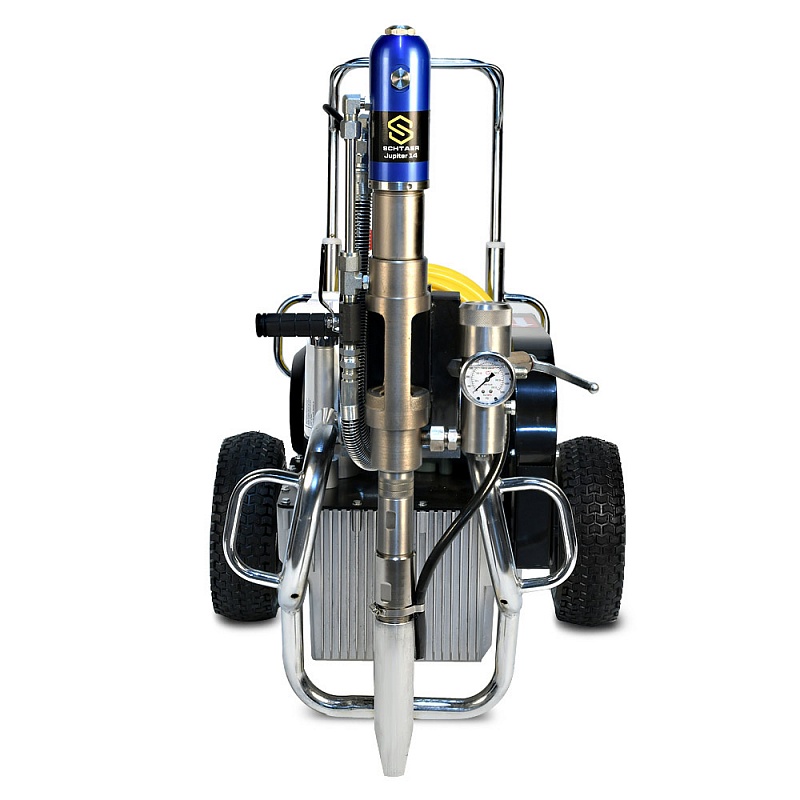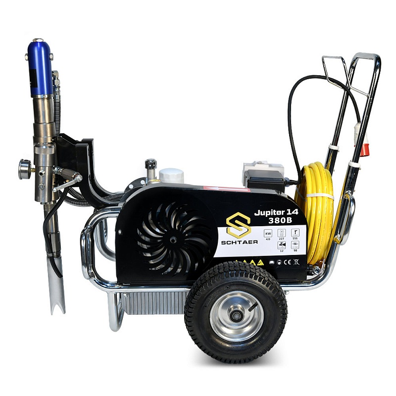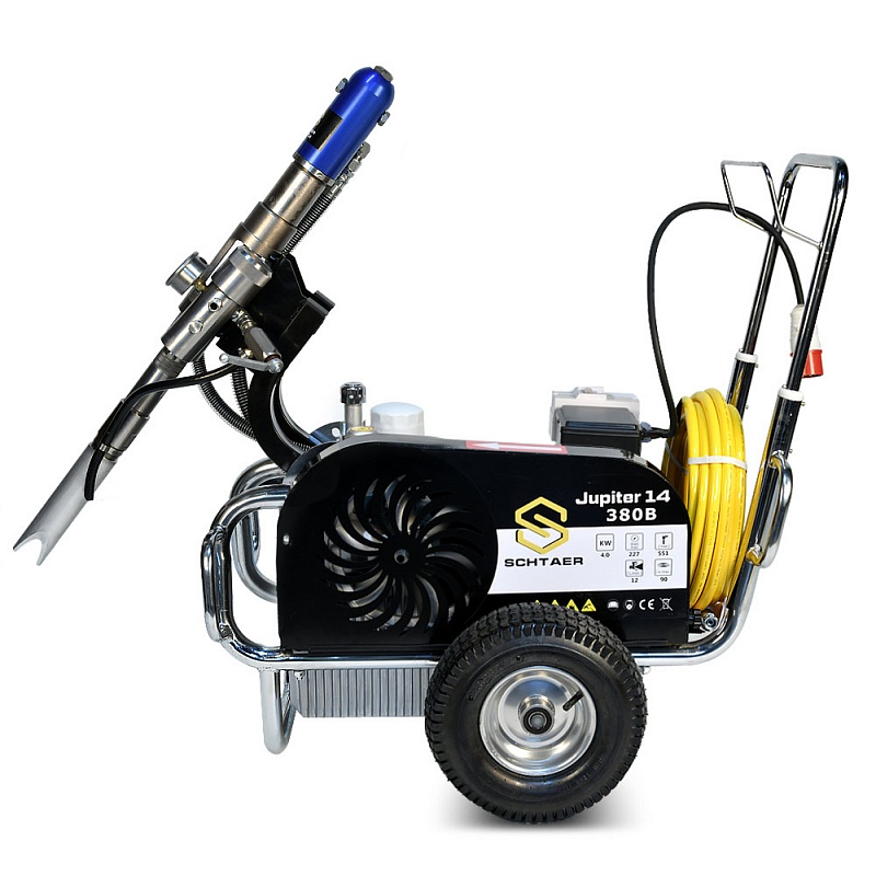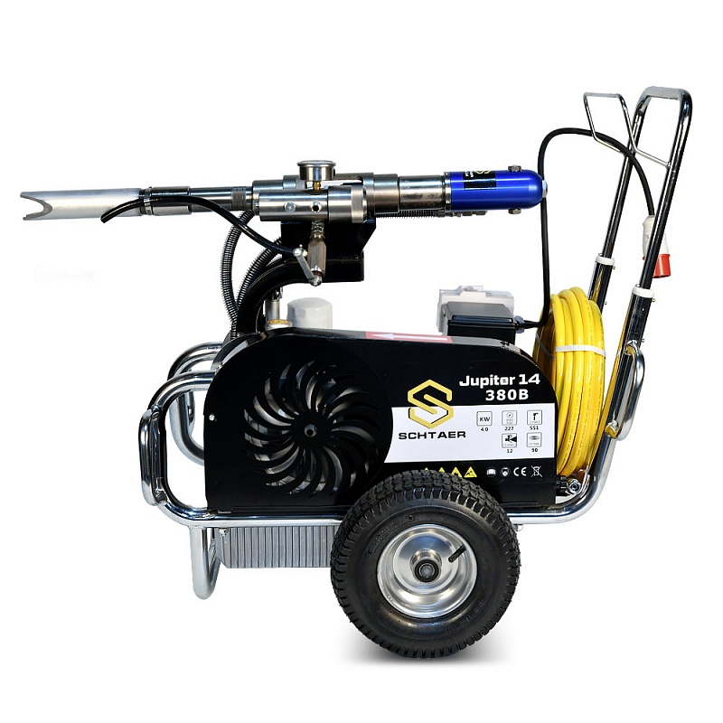 JUPITER 14 380В – это безвоздушный окрасочный аппарат, способный распылять материалы с высокой степенью вязкости. Он может использоваться для нанесения огнезащитных составов, гидроизоляционных материалов, антикоррозионных краскок, цинконаполненных материалов, эмалей, мастик, грунтовок, эмаей, мастик и другими лакокрасочными материалами. Сферы применения этой модели разнообразны. Ее используют для покраски стен, фасадов и потолков, металлических конструкций, бассейнов, крыш и куполов. Она может применяться при работе с балками, заборами, мостами и тоннелями, изготовленными из металла. Профессиональный аппарат подходит для нанесения дорожной разметки, но при этом потребуется дополнительное оборудование. Модель обладает высокой производительностью (12 л/мин), работает под давлением 230 Бар при мощности 4 000 Вт.