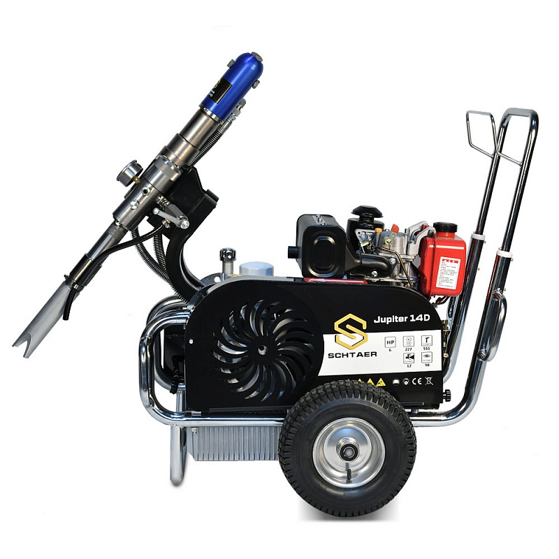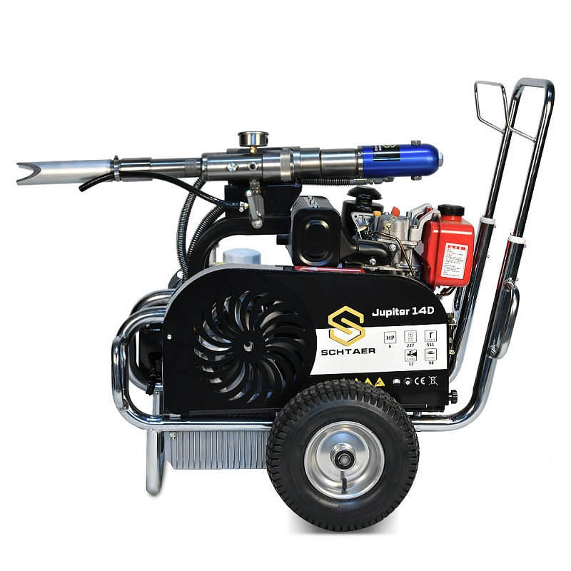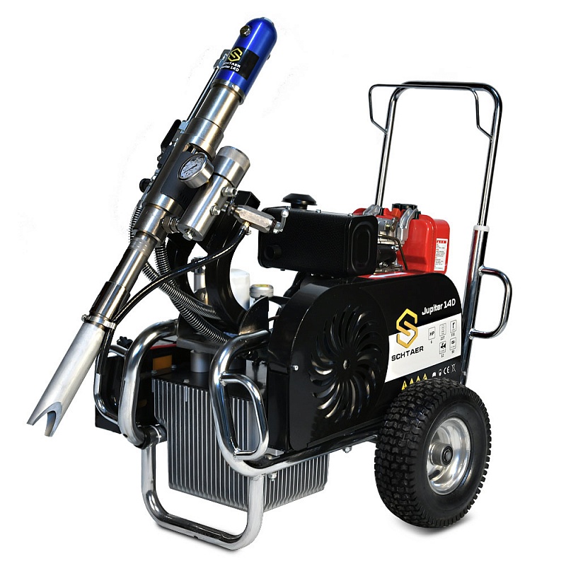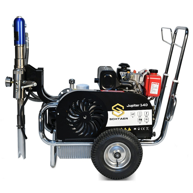 SCHTAER JUPITER 14 D – это безвоздушный дизельный окрасочный аппарат, предназначенный для распыления красок с высокой степенью вязкости. Его также используют при работе с огнезащитными составами, гидроизоляционными материалами, антикоррозионными красками, шпатлевками, цинконаполненными материалами, эмалями, мастиками, грунтовками и другими лакокрасочными материалами, предназначенными для нанесения через поршневой безвоздушный окрасочный аппарат. Сферы применения этой модели разнообразны. Ее используют для покраски стен, фасадов и потолков, металлических конструкций, бассейнов, крыш и куполов. Она может применяться при работе с балками, заборами, мостами и тоннелями, изготовленными из металла. Профессиональный аппарат подходит для нанесения дорожной разметки, но при этом потребуется дополнительное оборудование. Модель обладает высокой производительностью (14 л/мин), работает под давлением 230 Бар при мощности 4 000 Вт.