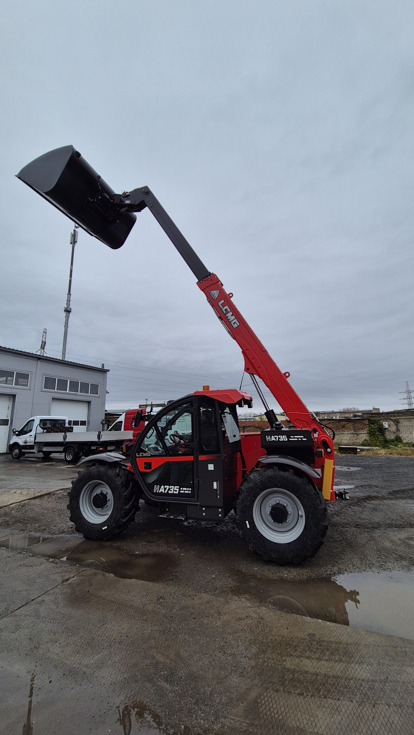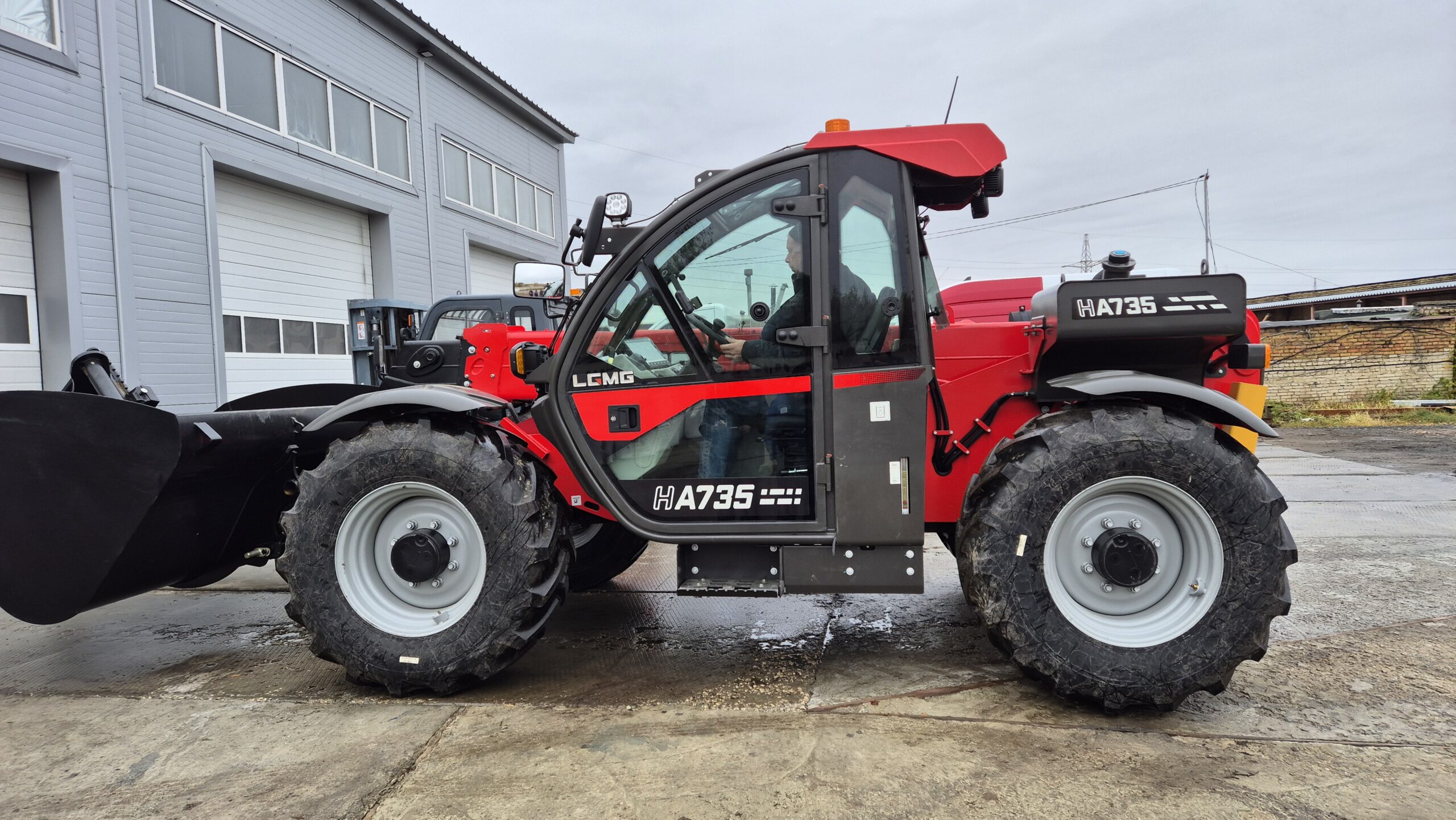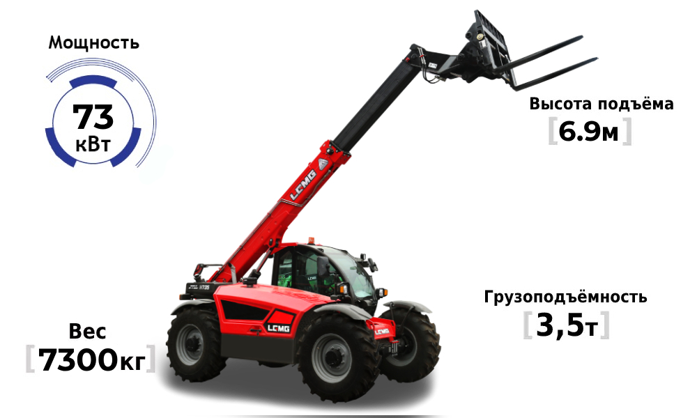 Полноприводный телескопический погрузчик LGMG НA 735 собирается на китайском заводе Lingong Heavy Machinery Co., Ltd. Одно из преимуществ данной модели — аксиально-поршневой насос рабочей гидравлики объёмом 45 куб. см (99л/мин), благодаря которому погрузчик может одновременно выполнять три движения: поднимать груз, выдвигать стрелу и работать кареткой, что сокращает время на погрузку и увеличивает производительность машины.
